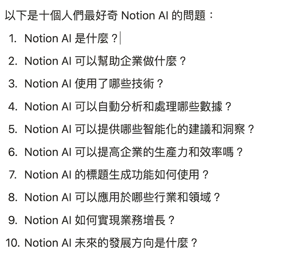 提問1:「請列出十個關於Notion AI的熱門標題」